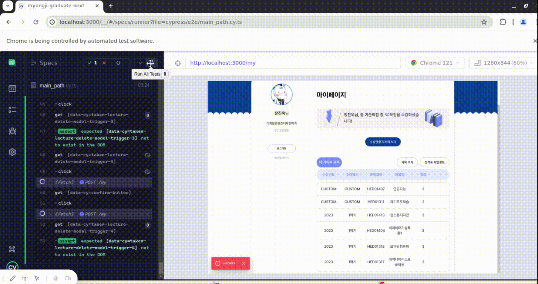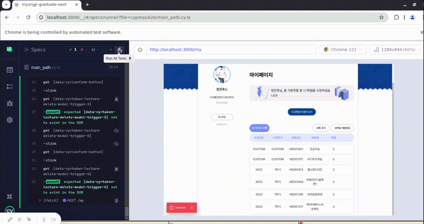 본격적으로 Cypress와 앱 작업을 적용하여 E2E 테스트를 작성해 보자. 필자는 사이드 프로젝트로 필자 모교의 졸업 요건을 검사할 수 있는 사이트를 운영하고 있는데, 해당 프로젝트의 사용자 주요 경로를 E2E 테스트로 만들어 관리하려고자 한다.