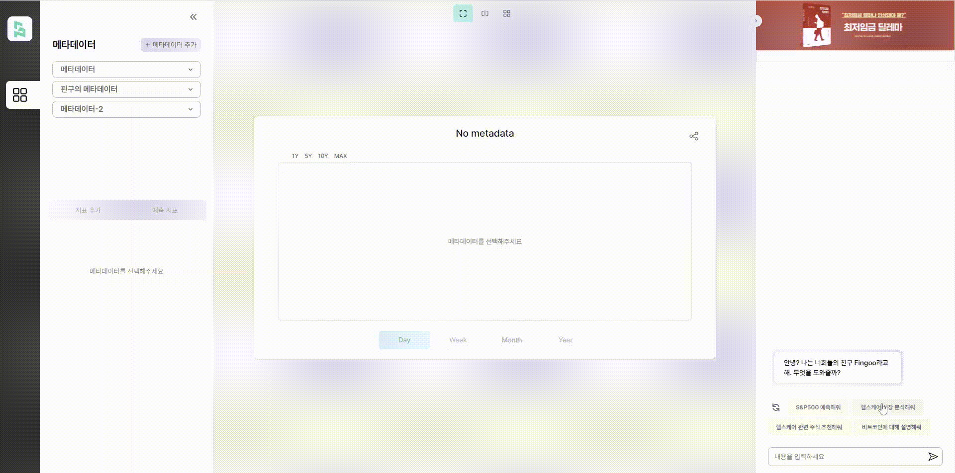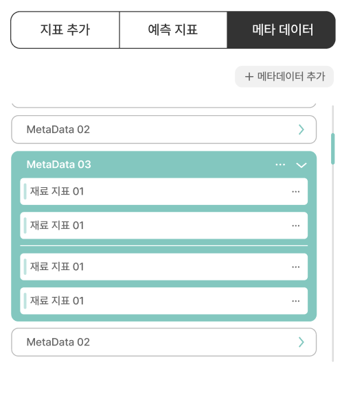 그런데 이러한 배치가 메타데이터와 지표 간의 관계를 이해하는데 오히려 헷갈리게 한다는 점을 발견하였고, 아래와 같이 UI/UX를 변경하여 이러한 개념적 관계를 더 잘 드러내고, 기본적으로 1개의 메타데이터가 자동 생성 및 선택되도록 기능을 추가하여 메타데이터를 여전히 신경 쓰지 않도록 하였습니다.