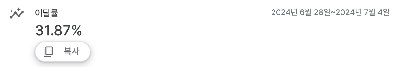 서비스 이탈률이라는 하나의 지표를 개선하는 것이었지만, 그 과정에는 여러 복잡한 문제가 얽혀 있었습니다. 이를 해결하기 위해 많은 고민과 활동을 했기에, 글로 정리하여 작성하기가 쉽지 않았네요. 베타테스트 이후 2~3주간 정말 정신없이 바쁜 나날을 보냈고, 앞서 말씀드린 것처럼 모든 팀원분들의 노력 덕분에 많은 개선을 이룰 수 있었습니다. 그 결과, 아래와 같이 서비스 이탈률을 31.87%로 낮춰 베타테스트를 무사히 마무리할 수 있었습니다.