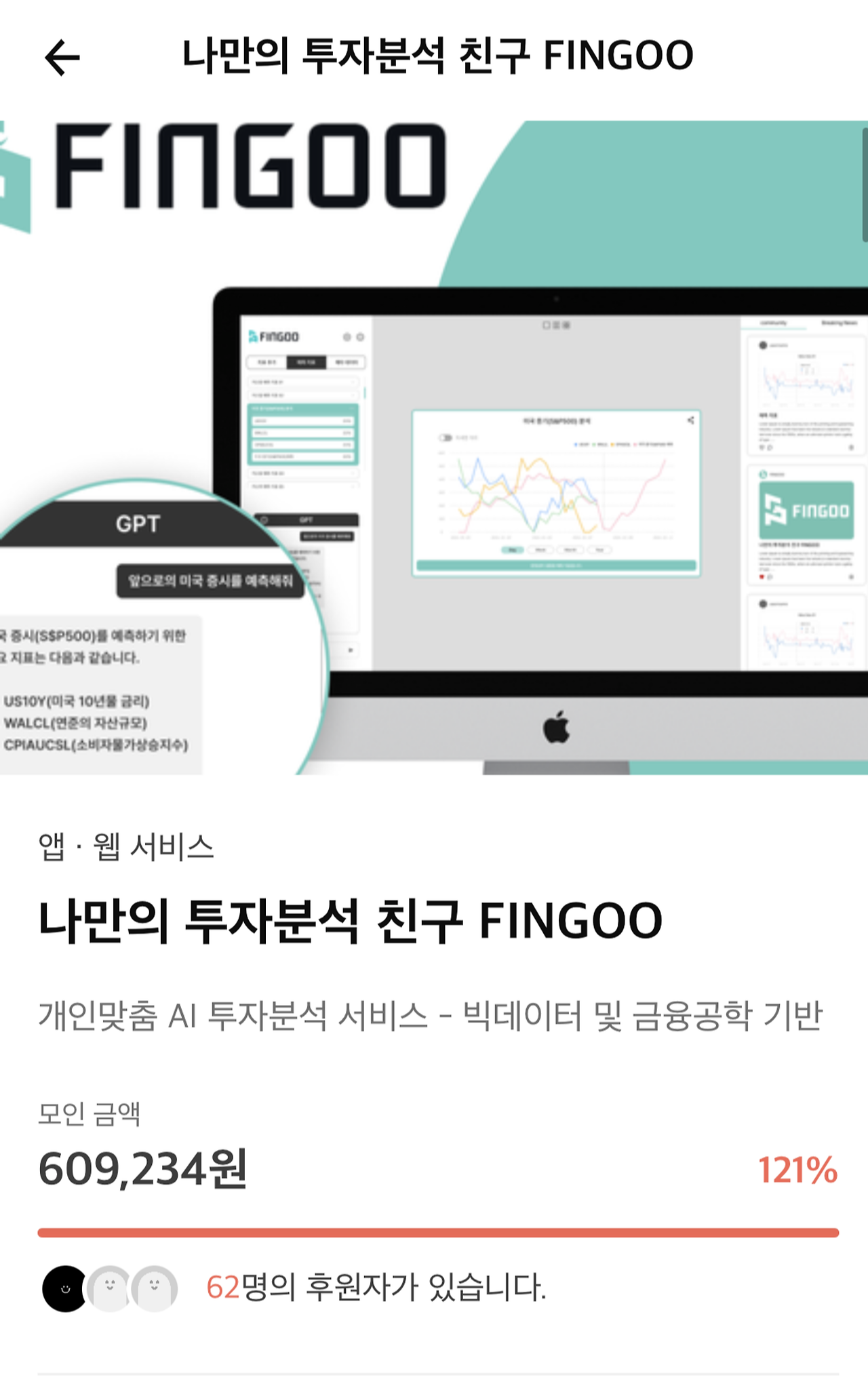 먼저 Fingoo는 '나만의 투자분석 친구’로 초보자도 쉽게 금융 투자를 할 수 있도록 개발한 서비스입니다. 베타테스트의 목적은 서비스의 가설을 검증하고 고객 데이터를 수집하여 기능을 개선하는 것이었는데요. 이를 위해 투자동아리 세미나와 마케팅을 통해 200명, 클라우드 펀딩으로 62명, 총 262명을 대상으로 5월 20일부터 7월 14일까지 8주간 베타테스트를 진행했습니다. 또한 펀딩 후원자분들에게는 더 나은 서비스를 제공하고자, 먼저 200명을 대상으로 베타테스트를 진행한 후 6월 17일부터는 펀딩 참여자들을 대상으로 베타테스트를 실시했습니다.
